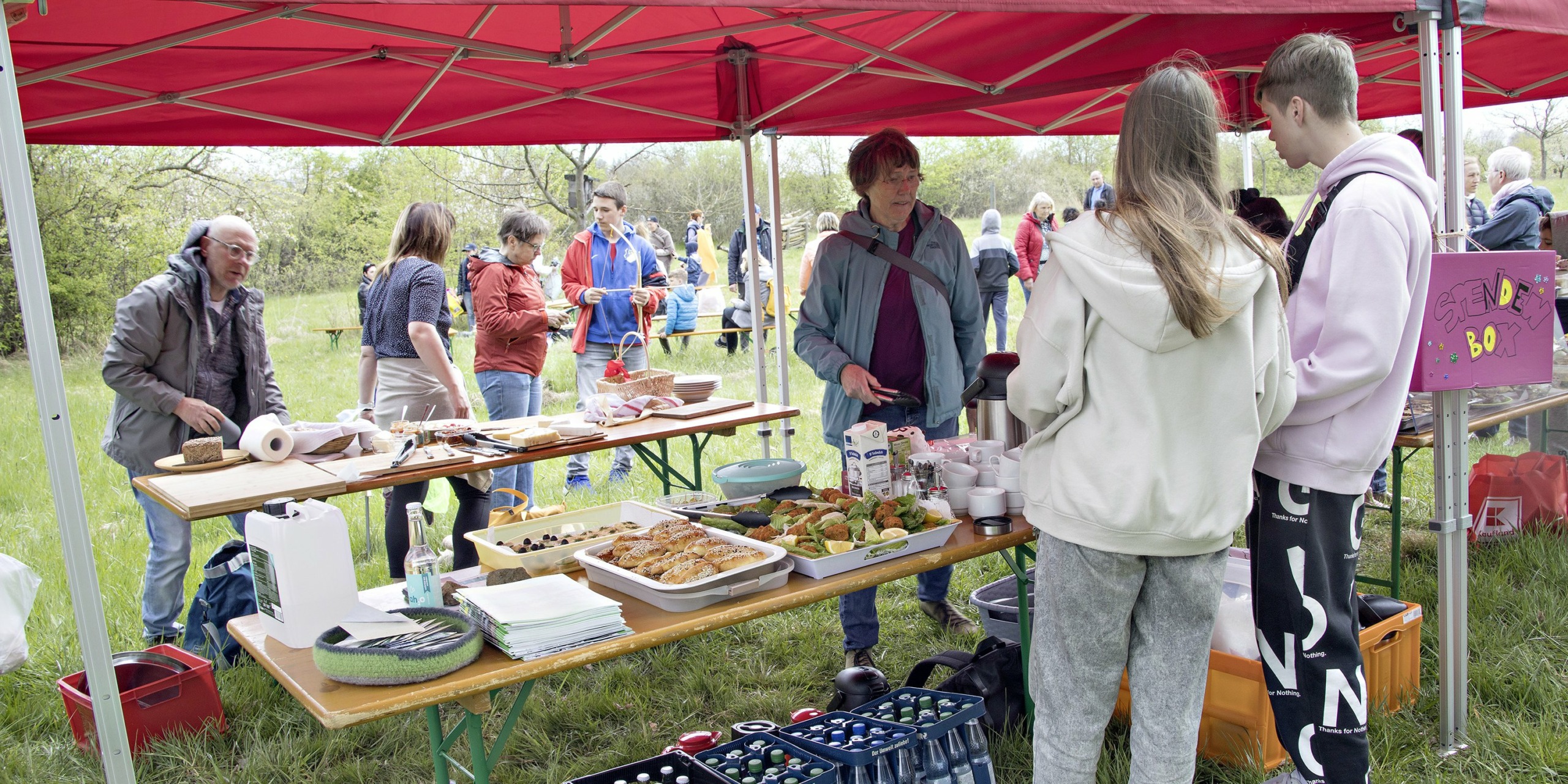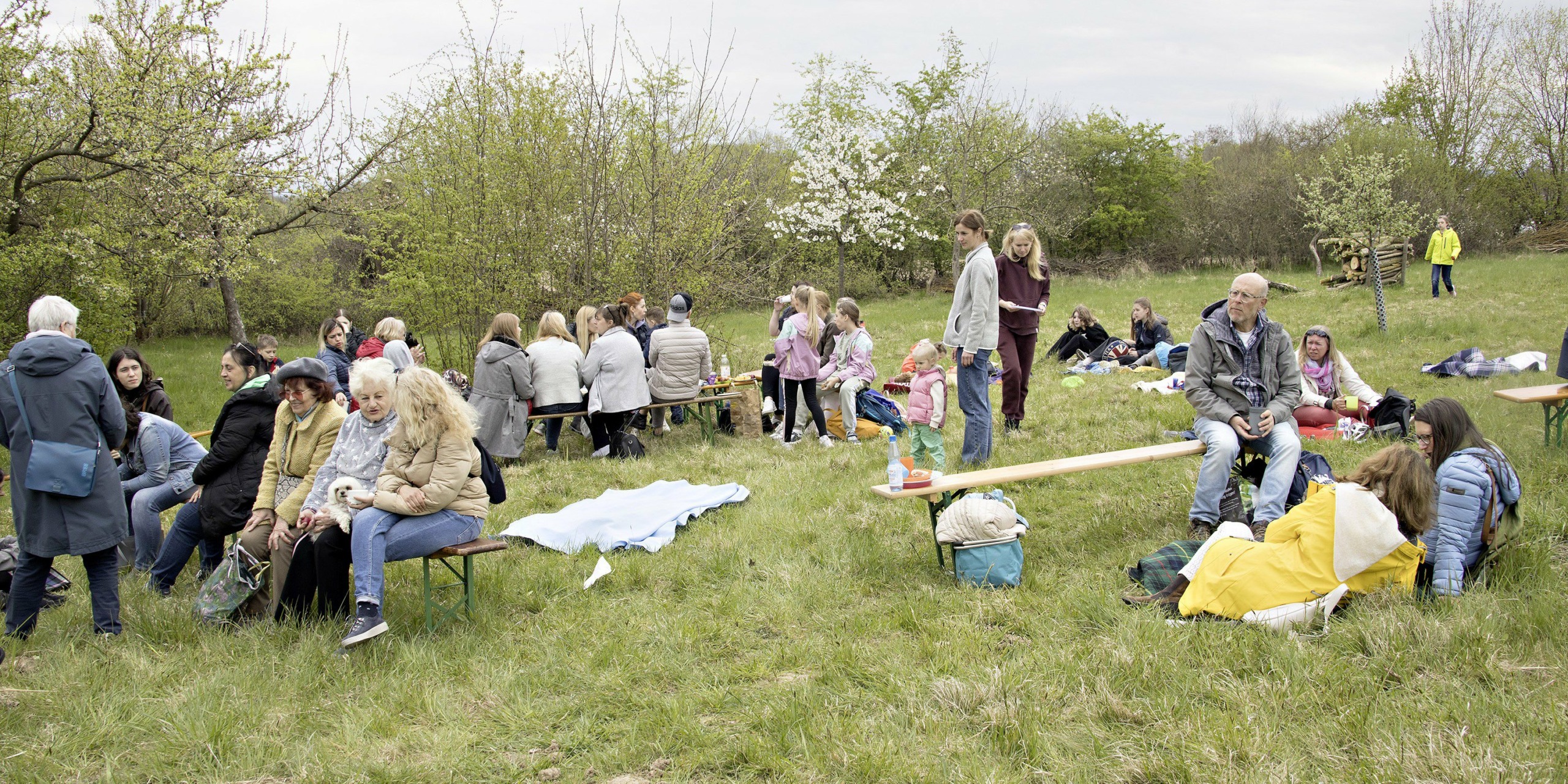 Es war trotz niedriger Temperaturen eine warme und offene Atmosphäre beim Picknick auf der Obstwiese mit ca. 40 Erwachsenen (überwiegend Frauen) und vielen Kindern.