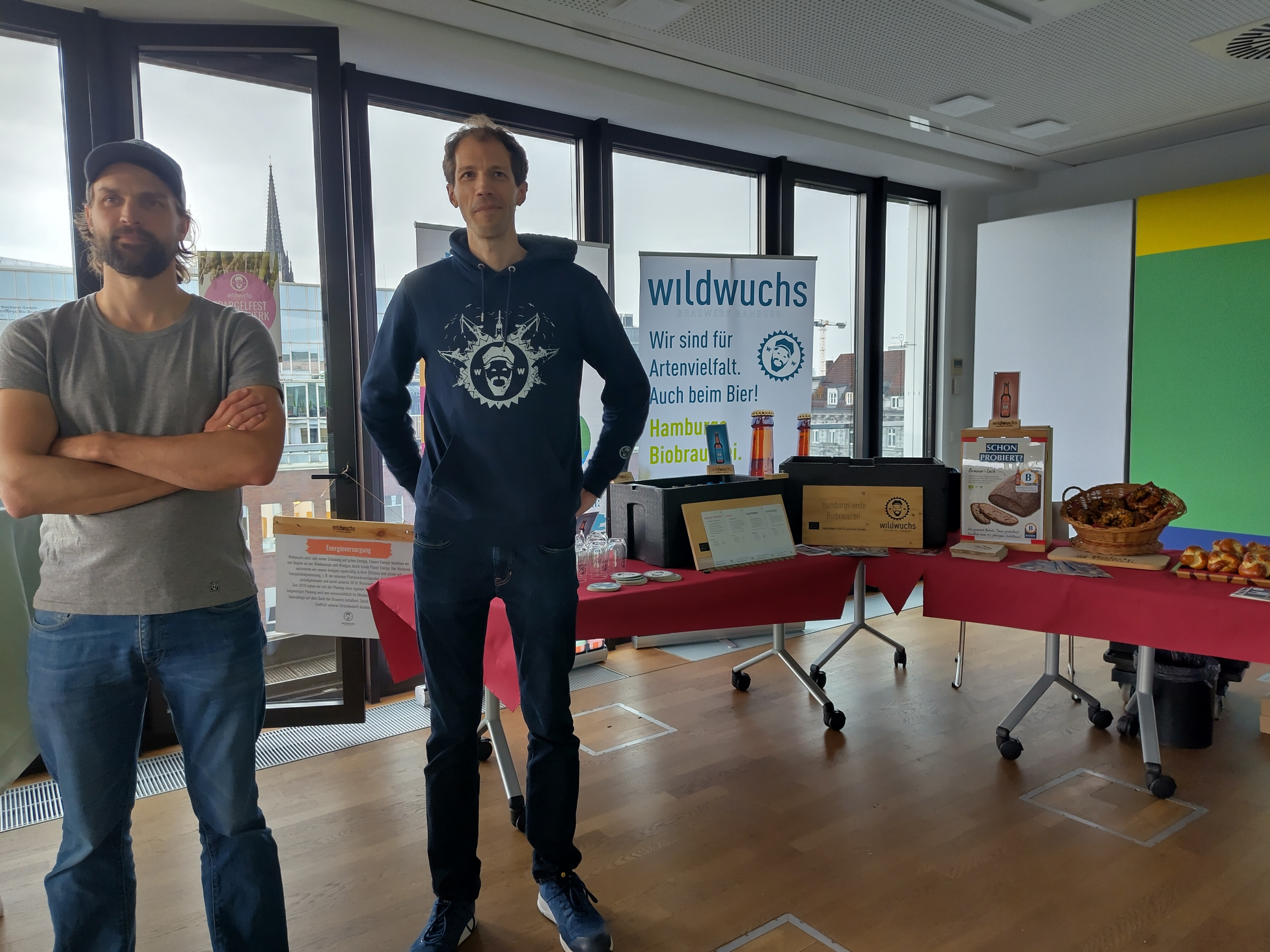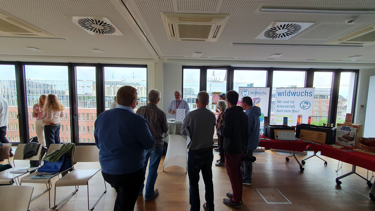 Nachdem sich alle anwesenden Initiativen mit ihrer Arbeit kurz und knackig vorgestellt hatten, konnten die rund 50 Teilnehmenden jede*n an einem eigenen Tisch im Raum mit Fragen löchern und dabei viele spannende Details erfahren. Dazu gab es wohlschmeckende Getränke und Gebäck vom gemeinwohl-orientierten Unternehmen Brauerei WiIdwuchs und der gemeinwohl-bilanzierten Bäckerei Bahde, die eine Kreislaufwirtschaft miteinander verbindet: unverkauftes Altbrot wird zu Brotbier verarbeitet und Trester aus dem Brauvorgang zu schmackhaftem Tresterbrot.