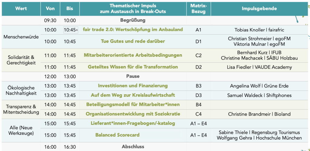 Beleuchtet wurden über den Tag verteilt 10 Themen mit Bezug zur aktuellen Version der Gemeinwohl-Bilanz 5.0 in sogenannten Break-Out-Sessions. In diesen Sessions stellte jeweils ein Unternehmen seine Maßnahmen zum Thema vor, die anschließend gemeinsam mit allen Unternehmer*innen der Break-Out-Session diskutiert wurde. Dieses Vorgehen führte tendenziell dazu, dass sich die Unternehmer*innen untereinander nicht nur besser kennenlernten, sondern auch Ideen zur eigenen Weiterentwicklung & Kooperation mitnehmen konnten.
