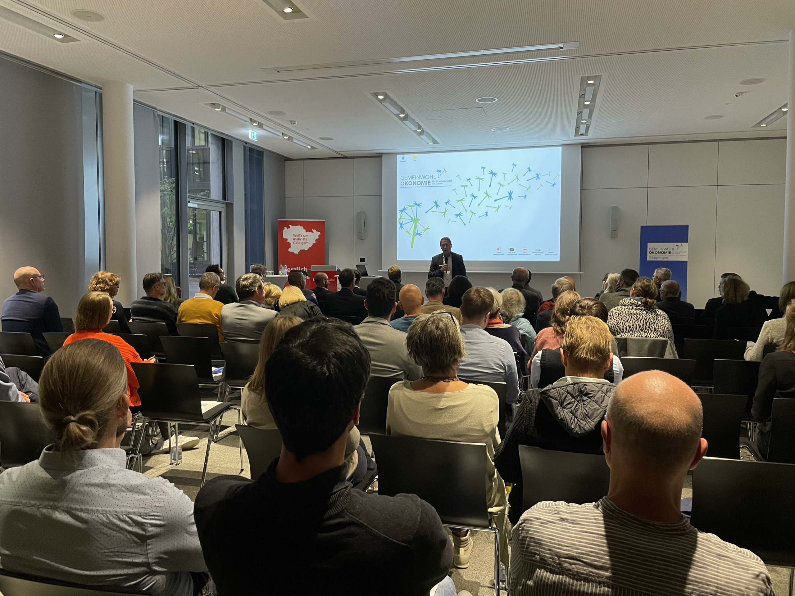 Am Mittwoch, dem 28. September, hatte die Regionalgruppe Göppingen der Gemeinwohl-Ökonomie gemeinsam mit der Kreissparkasse Göppingen und der Stadt Göppingen zu einer Infoveranstaltung eingeladen. Das Ziel: Lokalen Unternehmen die Gemeinwohl-Ökonomie näherzubringen. Rund 60 Personen sind der Einladung ins Sparkassenforum gefolgt.