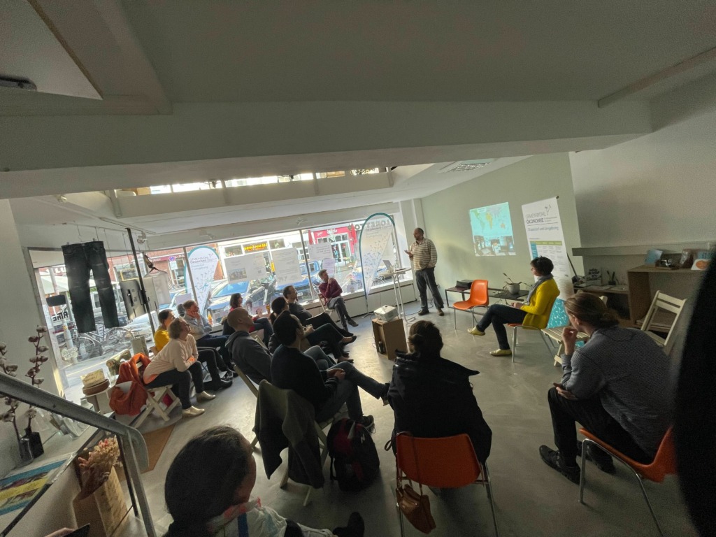Neben Mitgliedern der Regionalgruppe kamen GWÖ-Interessierte aus Düsseldorf, aber auch Gäste aus der Nachbarschaft, die das von uns einige Wochen zuvor gestaltete Zukunftsfenster zur Idee der GWÖ gesehen hatten.