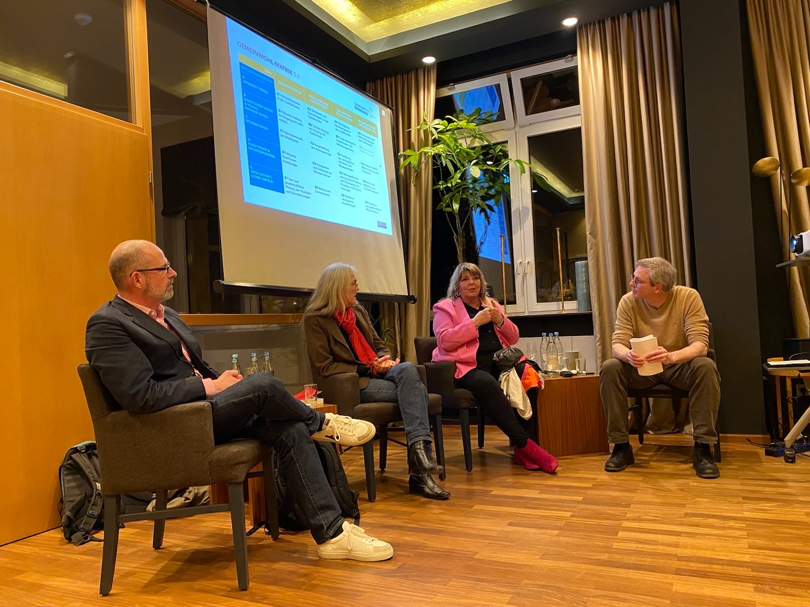 Am 23. März 2023 hatte die GWÖ Regionalgruppe Frankfurt zu einer Podiumsdiskussion mit dem Thema „GWÖ meets New Work“ eingeladen. Diese Veranstaltung war ein voller Erfolg. Es waren ausser 10 GWÖ Aktiven ca. 30 Gäste in die Villa Orange gekommen. Christiane Hütte hat die Anwesenden als Hausherrin begrüßt, Ulrich Rücker als „New Work“-Experte und Gründer und Inhaber von meta-system GmbH hat nach seinem Impulsvortrag zum Thema die Podiumsdiskussion moderiert. Auf dem Podium saßen