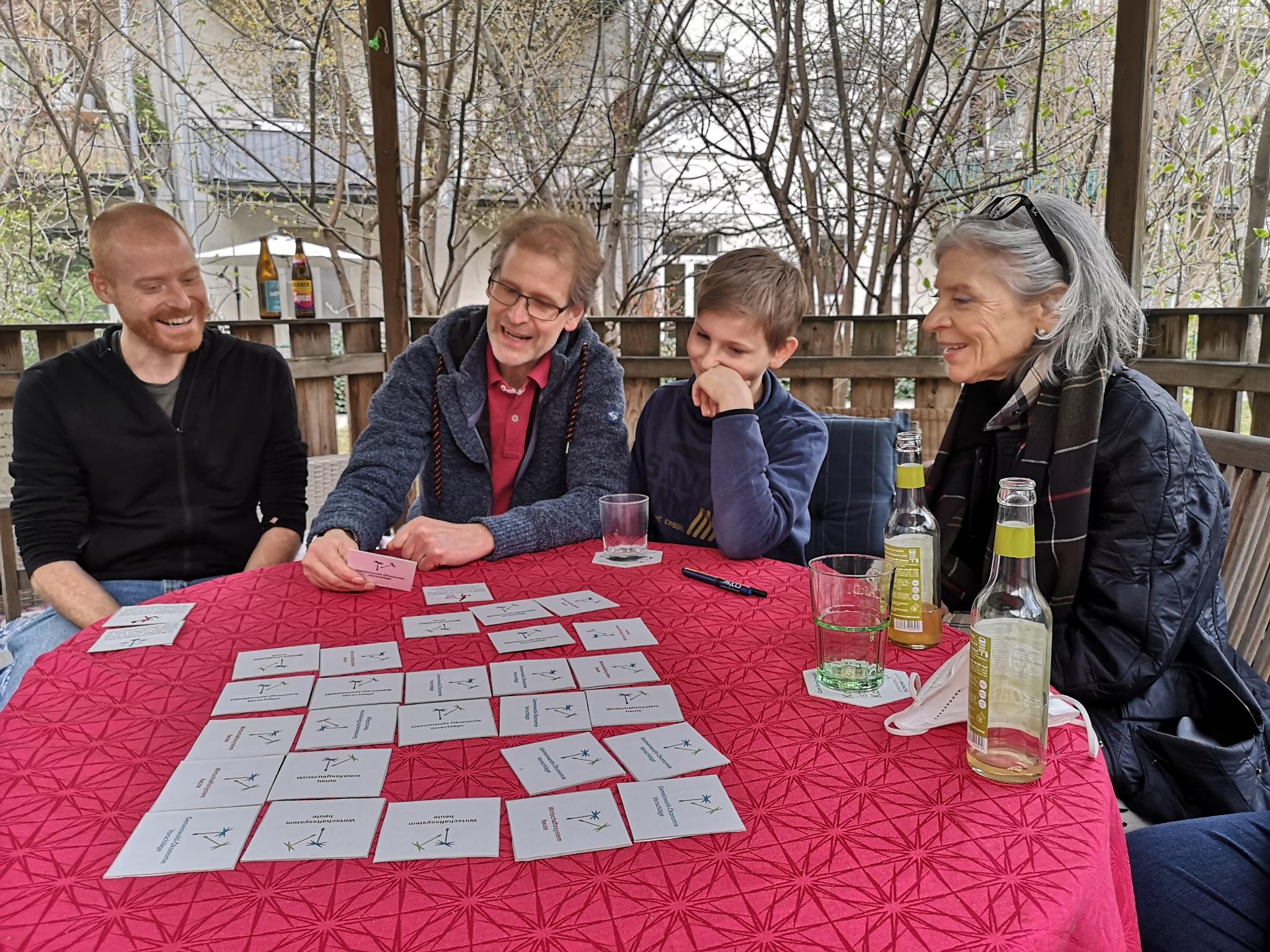 Heute wird das GWÖ-Memory aka Eckpunkte-Spiel gespielt. Jetzt gilt es Gegensatz-Paare zu finden: aus dem derzeitigen und aus dem GWÖ-Wirtschaftsystem. Immer wieder entstehen dabei gute und tiefe Diskussionen, die besonders durch den 13-jährigen Neuzugang und GWÖ-Begeisterten Caspar bereichert werden.