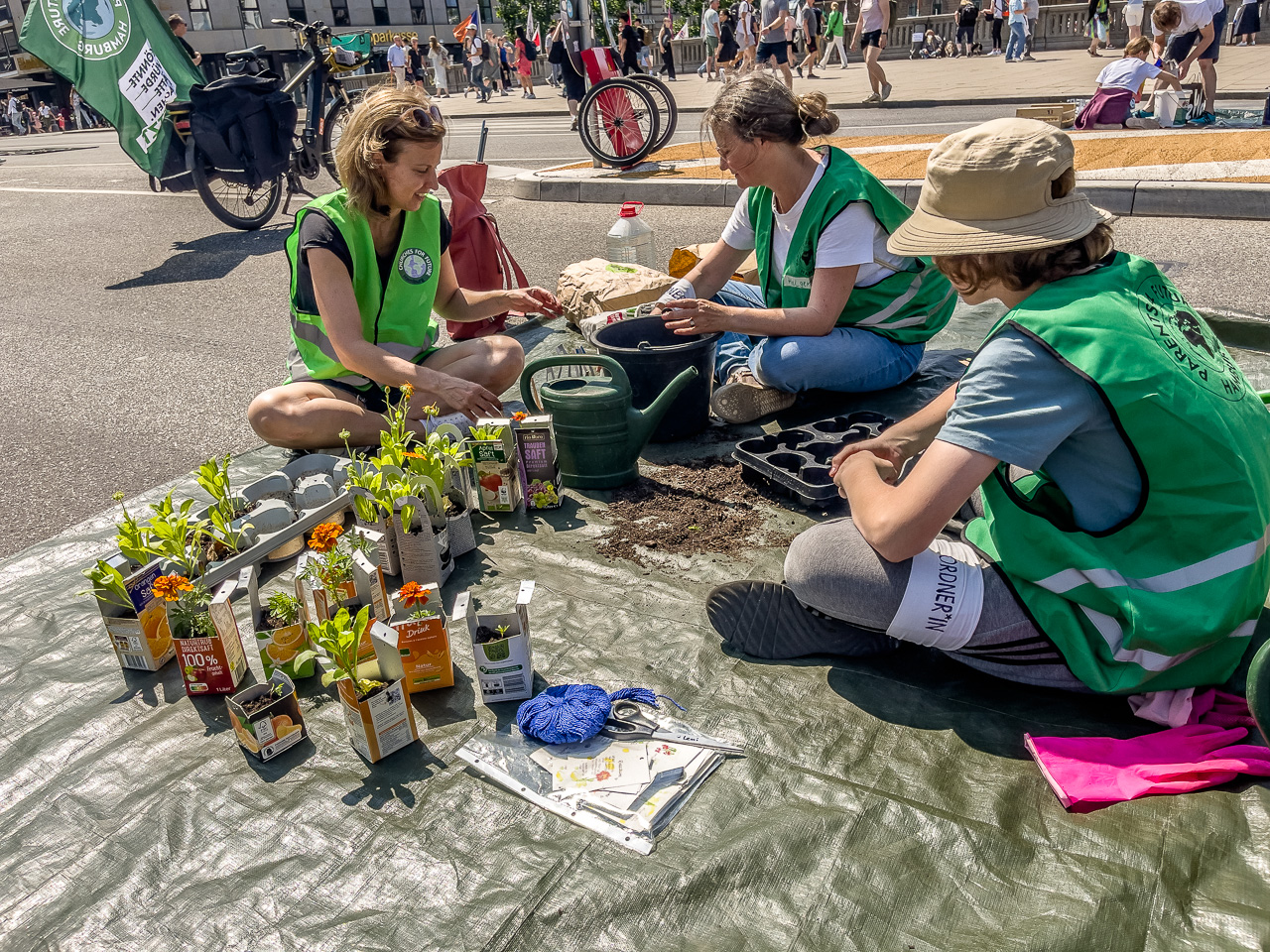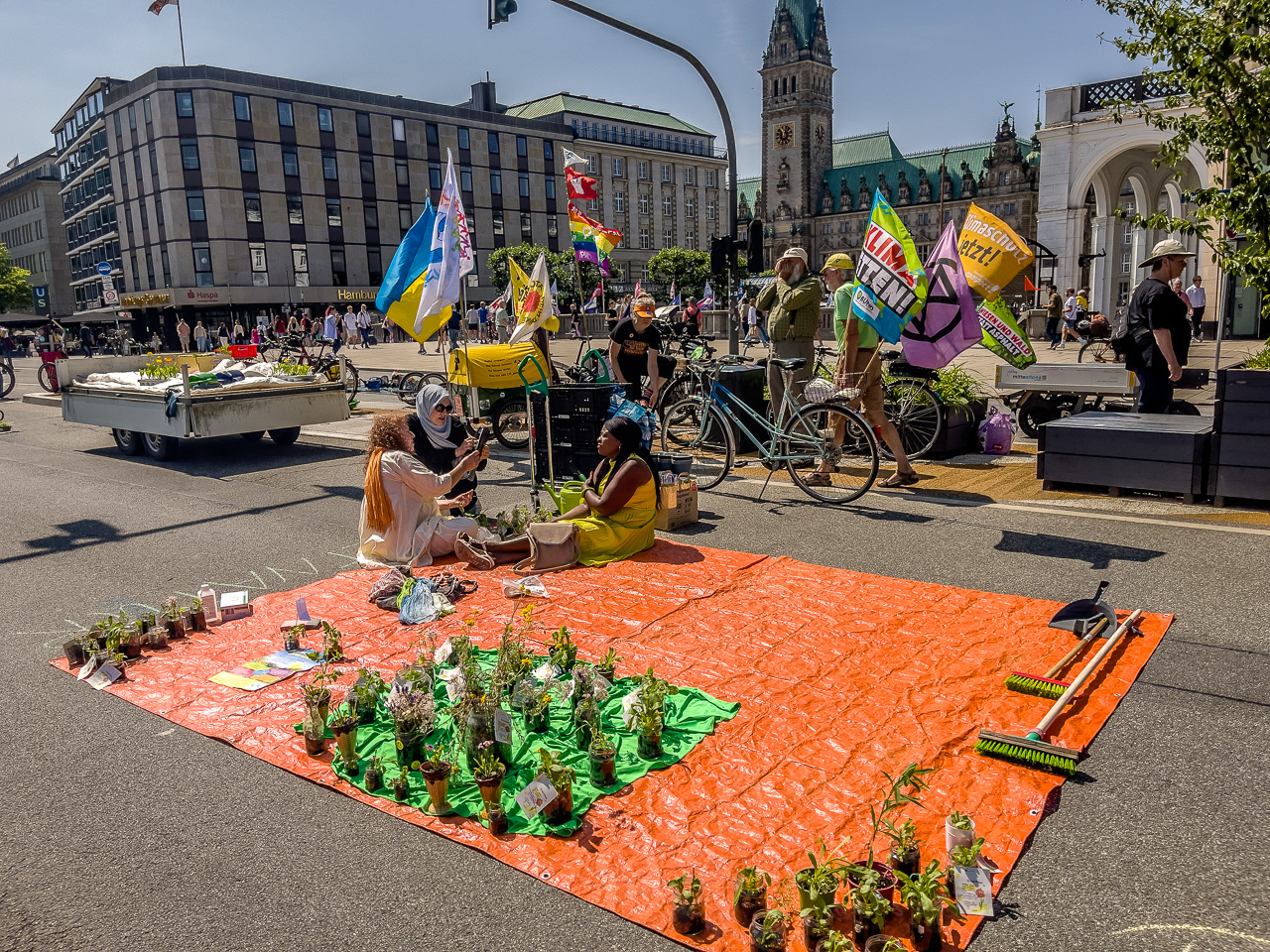 Mehr als ein Dutzend Initiativen der Klimagerechtigkeitsbewegung sind dieser Einladung gern gefolgt. Gemeinsam haben sie den Jungfernstieg in ein Meer aus Pflanzen verwandelt.