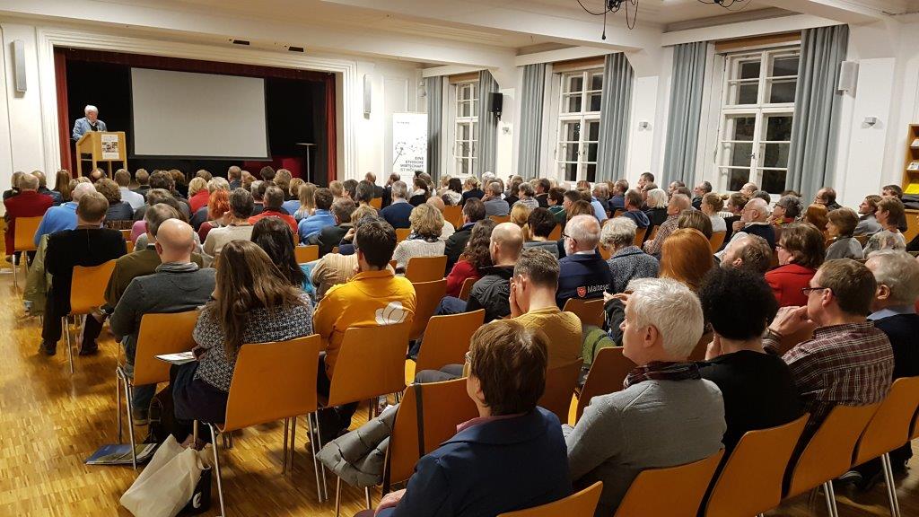 Grzega stellt dem Neoliberalismus als evolutionäres Zukunftsmodell eine gemeinwohl-orientierte und ökosoziale Marktwirtschaft entgegen und erhielt zum Abschluss großen Applaus der Besucher für seine Mut machenden und auffordernden Worte.
