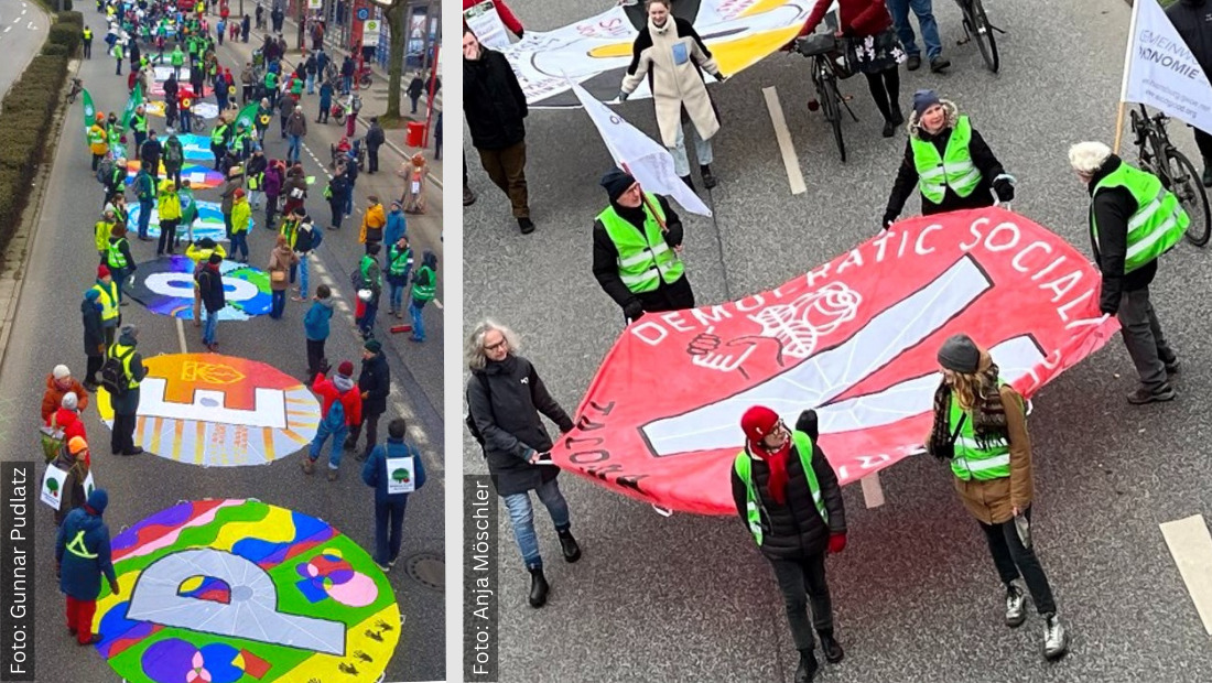 Die Klimakrise pausiert nicht – weder über die Feiertage, noch während anderer Krisen wie Corona oder Krieg. Auch die Parents for Future Hamburg legten keine Pause ein und stellten einen gelungenen „Sprung ins neue Jahr“ auf die Beine: Im Schulterschluss mit über 20 Hamburger Organisationen, darunter die Gemeinwohl-Ökonomie (GWÖ) Hamburg, forderten sie mit einer eindrucksvollen, bunten Fallschirmaktion eine Klimapolitik, die ihren Namen verdient. Das gemeinsame Motto PEOPLE OVER PROFIT setzte ein starkes Zeichen – mit 16 bunten Fallschirmen, die die Organisationen von den Landungsbrücken in St. Pauli bis zur Elbphilharmonie trugen.