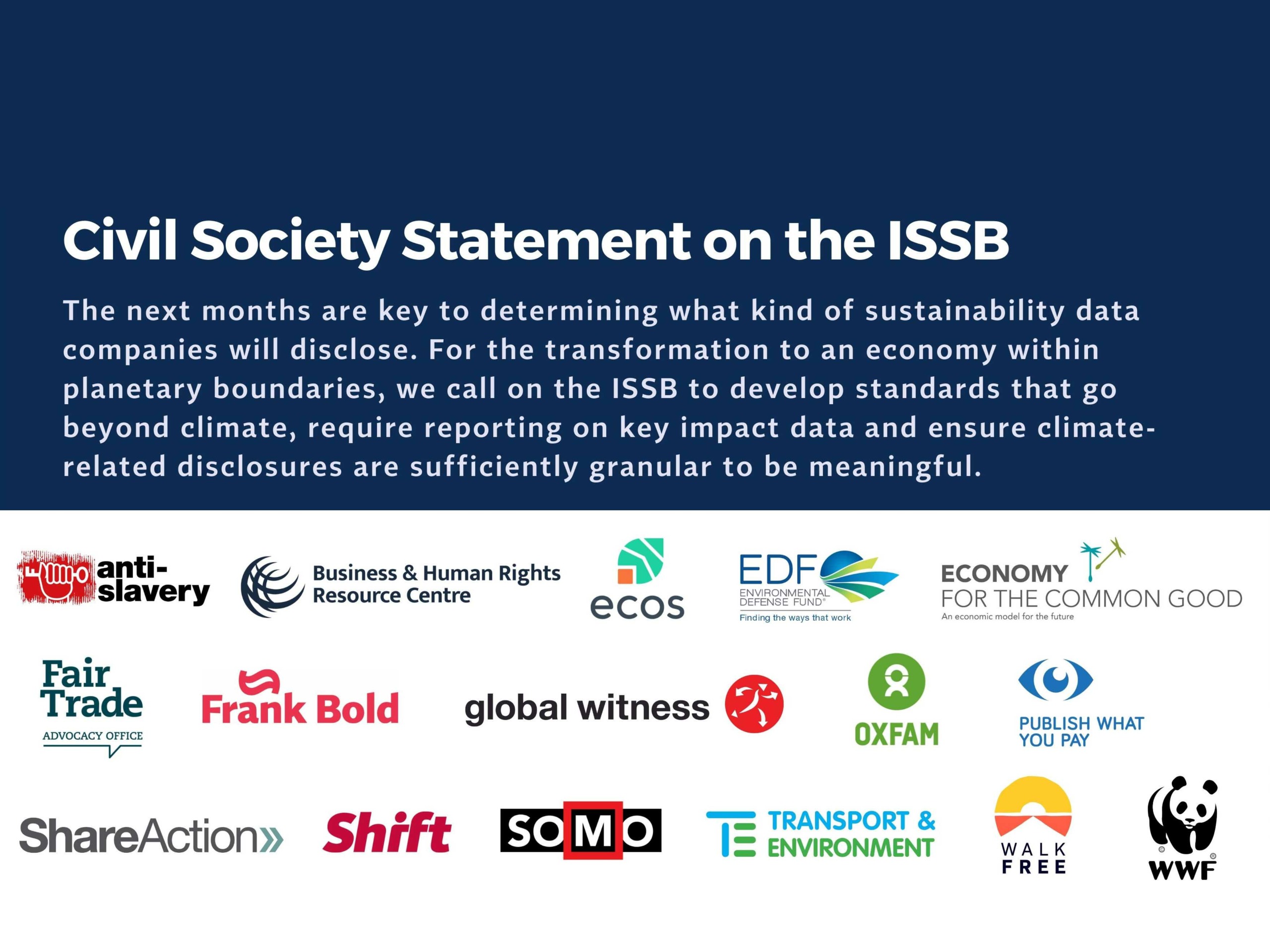 Anti-Slavery International, Business and Human Rights Resource Centre, ECOS, Environmental Defense Fund Europe, Economy for the Common Good (Gemeinwohl-Ökonomie), Fair Trade Advocacy Office, Frank Bold, Global Witness, Oxfam, Publish What You Pay, ShareAction, Shift, SOMO, Transport & Environment, WalkFree, WWF