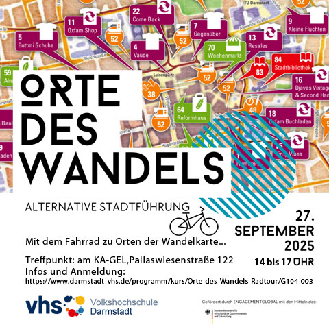 Darmstadt ist voll von Orten und Menschen, die mit kreativen Ideen und Leidenschaft zeigen, dass eine andere Art des Lebens und Wirtschaftens möglich ist: fair, ressourcenschonend und klimatauglich. Auf dieser Stadtführung zu „Orten des Wandelns“ erkunden wir per Rad auf den Spuren der Wandelkarte einige dieser Orte. Wir sprechen mit Menschen, die sich für Ihre Mitmenschen und unseren Planeten engagieren und lernen spannende Projekte kennen. Die Tour endet im Bayerischen Biergarten, wo wir den Tag bei einem kühlen Getränk und sicherlich auch dem ein oder anderem interessanten Gespräch ausklingen lassen. Bitte unbedingt ein Fahrrad mitbringen!