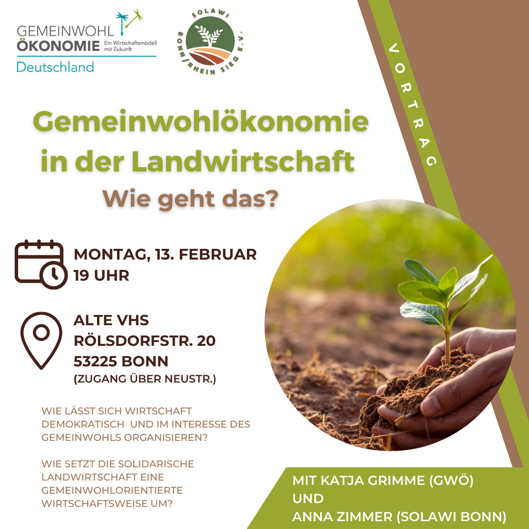 Eine Form der Landwirtschaft, die eine neue Form des Wirtschaftens praktiziert, ist die Solidarische Landwirtschaft (SoLaWi). Anna Zimmer vom Verein SoLaWi Bonn/Rhein-Sieg e.V. stellt daher im Anschluss ihre Organisation vor – ein Verein, der (Gemüse-)Konsument*innen und Produzent*innen zusammenbringt, um regionales und saisonales Biogemüse zu solidarischen Preisen für Menschen unterschiedlichster Einkommen zugänglich zu machen. Wir freuen uns im Anschluss daran auf die Diskussion mit euch, um zu sehen, wie wir mit der Agrarwende und den wirtschaftlichen Veränderungen, die wir alle brauchen, weiterkommen!