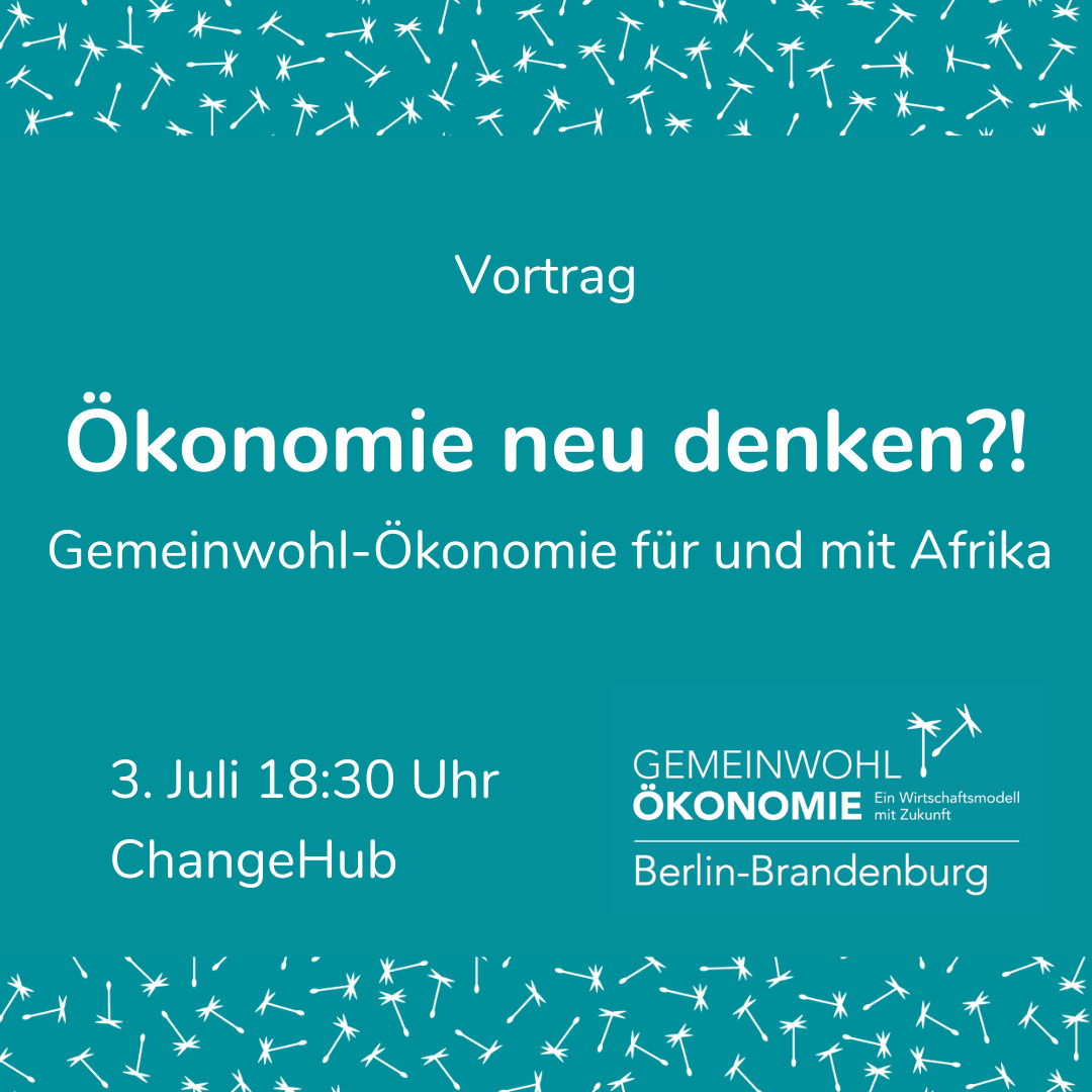 Am 3. Juli wird um 18.30 Uhr im ChangeHub in der Hardenbergstr. 32 in 10623 Berlin zu diesem Thema diskutiert. Nach einer kurzen Einleitung zur Gemeinwoh-Ökonomie von Dr. Cornelia Kühn unterhalten sich Dr. Boniface Mabanza und Marjam Mayer über Chancen und Wege zu einer anderen Ökonomie und die Notwendigkeit eines anderen Umgangs mit Ressourcen. Nach dem Podiumsgespräch ist das Publikum herzlich eingeladen, mitzudiskutieren.