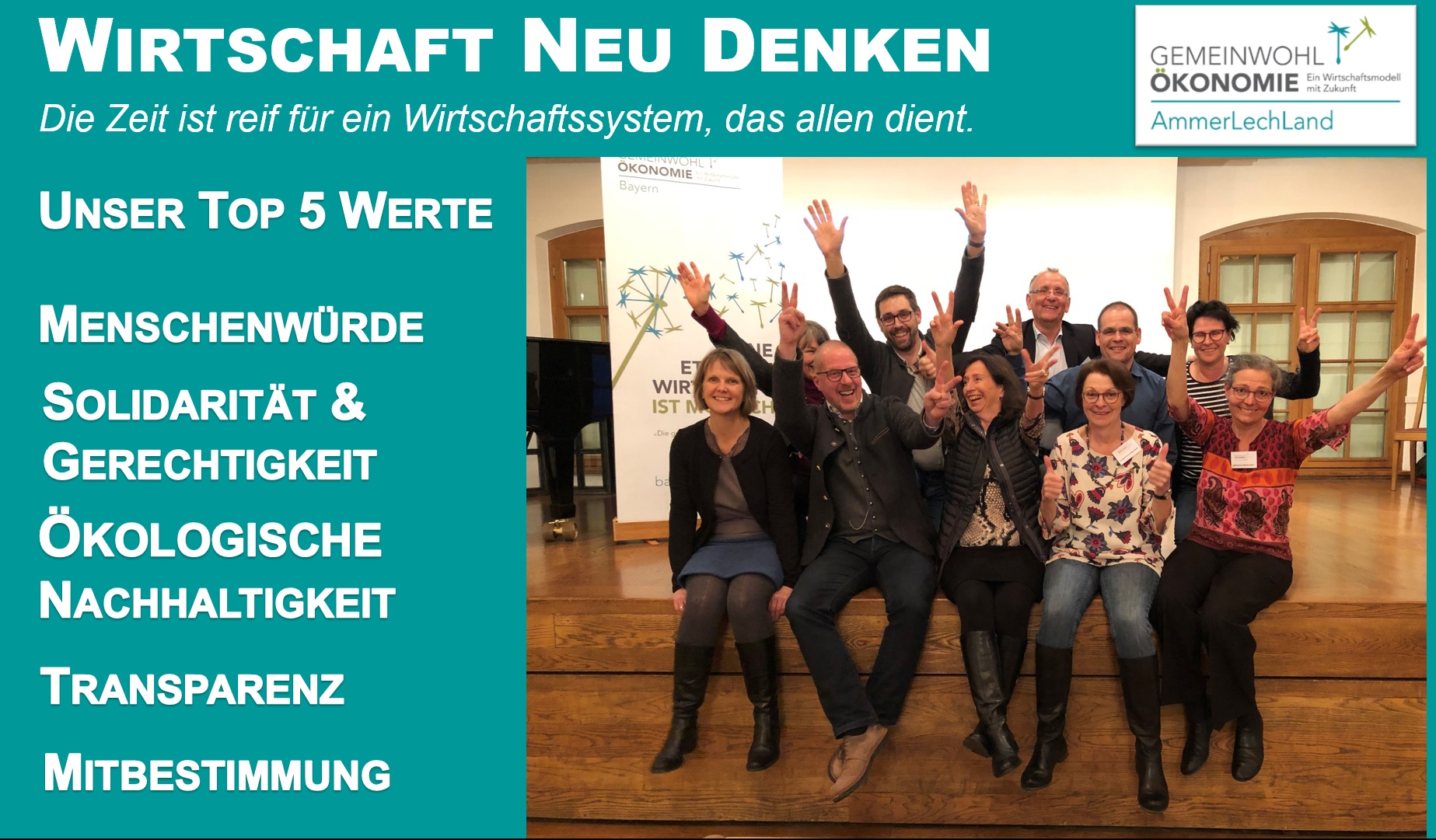 Mehr Menschen, Unternehmen und Organisationen sowie Kommunen für sinn- bzw. werte-orientiertes Wirtschaften im Allgemeinen sowie die Gemeinwohl-Ökonomie und deren Werkzeuge im Speziellen zu begeistern, ist unsere Mission.