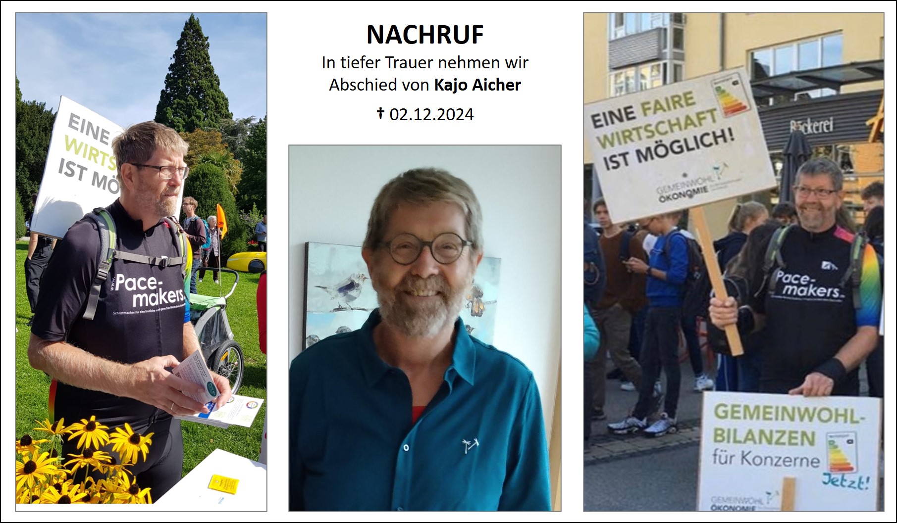 Mit Kajo verlieren wir einen leidenschaftlichen Kämpfer für eine gerechtere Welt und eine intakte Umwelt. Sein Engagement war unermüdlich und vielseitig: beim Bündnis 90/die Grünen, im Arbeitskreis Peru, beim Einsatz für die südamerikanische Gemeinde Porcón, als Mitgestalter bei Weltpartner Ravensburg und im Eine Welt Verein in Tettnang, oder als treibende Kraft in unserer Regionalgruppe Bodensee-Oberschwaben der Gemeinwohl-Ökonomie – Kajo lebte für seine Überzeugungen. Auch als Stadtrat in Tettnang von 2014 bis 2024 setzte er sich konsequent für Nachhaltigkeit und soziale Gerechtigkeit ein.