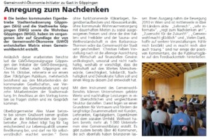 – 09. Juni: „Gemeinwohl Ökonomie – ein Wirtschaftsmodell mit Zukunft“ – Impulsreferat und Diskussion.
