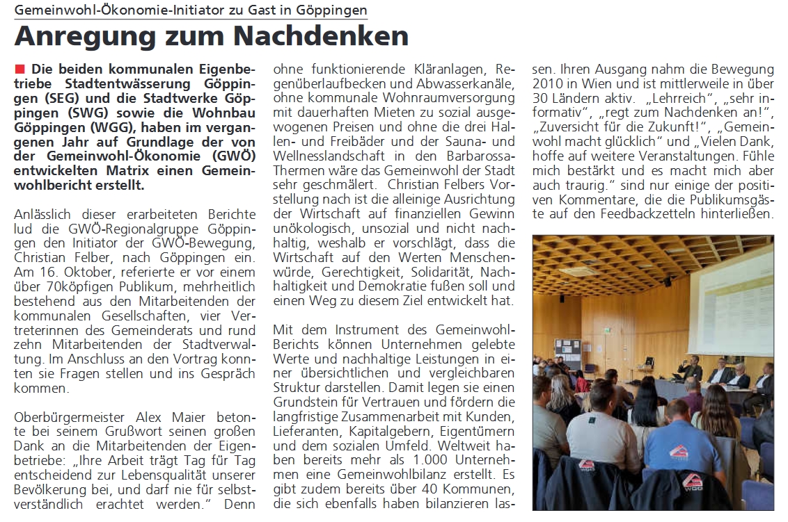 – 16. Oktober: Veranstaltung mit Christian Felber, Präsentation GWÖ-Berichte der drei Eigenbetrieben der Stadt Göppingen –  Stadtwerke, Wohnbau und Stadtentwässerung. Abends öffentliche Veranstaltung mit Christian Felber im Forum der KSK.