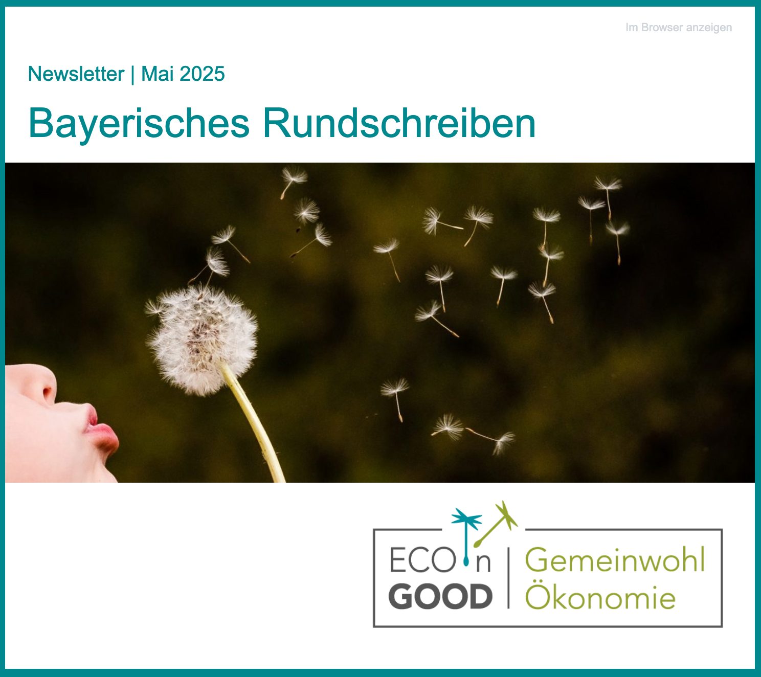 Das „Bayerische Rundschreiben“ informiert monatlich über die aktuellsten Entwicklungen zur Gemeinwohl-Ökonomie in Bayern und punktuell auch darüber hinaus. Dieser Newsletter kann von allen Interessent*innen abonniert und mittels eines Links am Ende jeden Newsletters jederzeit wieder widerrufen werden. Letzte Ausgabe verpasst? Alle Ausgaben finden sich in diesem Archiv.