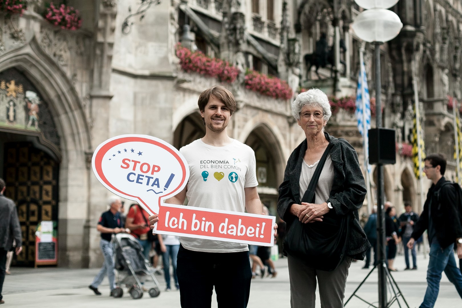 Wir setzten uns für eine Orientierung der Wirtschaft und Gesellschaft am Gemeinwohl ein und sind der Meinung das die Freihandelsabkommen TTIP und CETA eine krasser Rückschritt in einer solchen Entwicklung darstellen. Deshalb setzten wir uns, gemeinsam mit vielen Partnerorgansiationen gegen diese Abkommen ein und unterstützen das bayrische Volksbegehren gegen CETA aktiv.