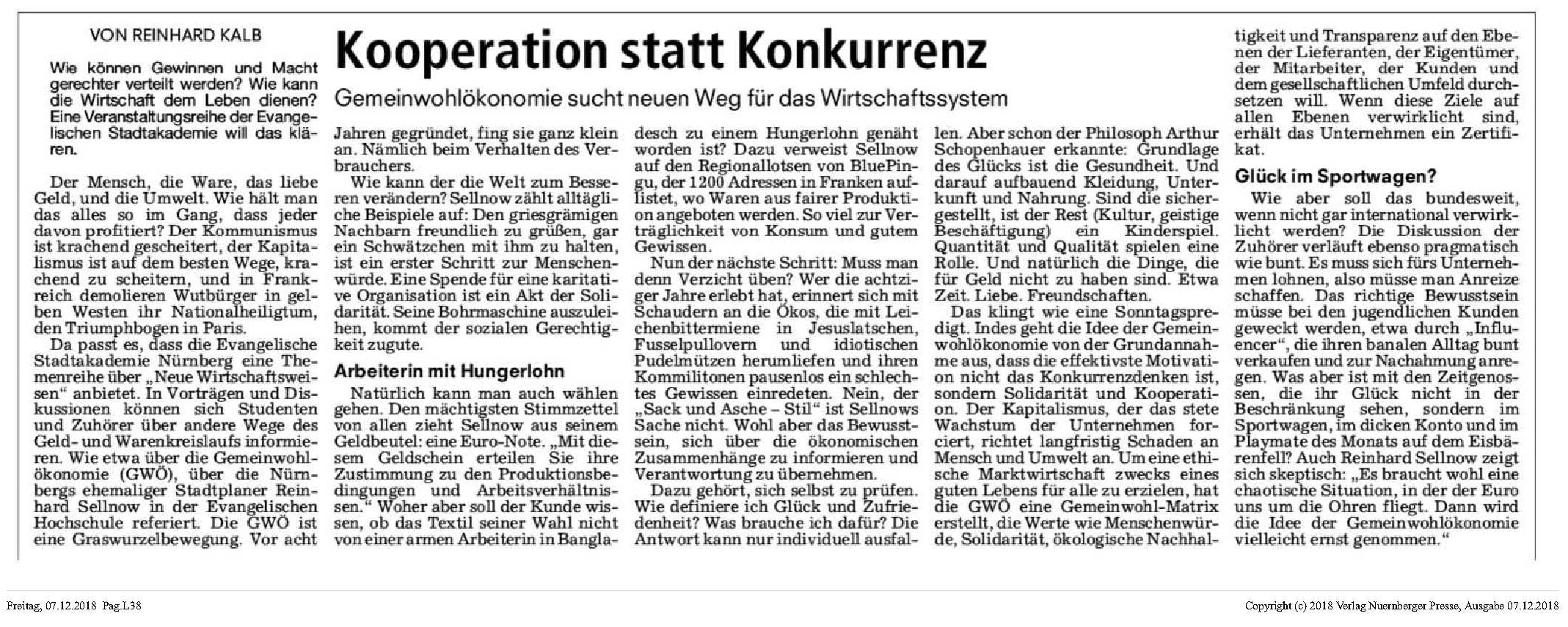 Am Mittwoch, den 05. Dezember 18, fand in der Evang. Hochschule in Nürnberg der GWÖ-Vortrag von Reinhard Sellnow statt. 45 interessierte Teilnehmer*innen waren gekommen, um danach noch ausgiebig darüber zu diskutieren. Bei grundsätzlicher Zustimmung kamen auch nachdenkliche Stimmen zu Wort, die die derzeitige Ignoranz von Parteien und Staat beklagten (kein Thema für sie, keine Unterstützung), aber auch fragten, wie man denn der heutigen Jugend das Thema nahe bringen könnte. Nachhaltigkeit sei weder chic noch sexy, würde oft mit Verzicht gleichgesetzt und tauche kaum in den digitalen Medien auf, die diese Jugend nutzt. Müßte man vielleicht angesagte Blogger als GWÖ-Influencer gewinnen? Wie kommt man mit diesen Gedanken an die großen Konzerne ran? Wie gewinnt man Unternehmer, wenn es derzeit kaum direkte Vorteile und Nutzen dafür gibt und eine ernsthafte GWÖ-Bilanz unter Einbezug der Mitarbeiter*innen sehr aufwendig und damit teuer ist? Die Nürnberger Nachrichten haben den Abend journalistisch aufbereitet und umgehend diesen Artikel platziert: