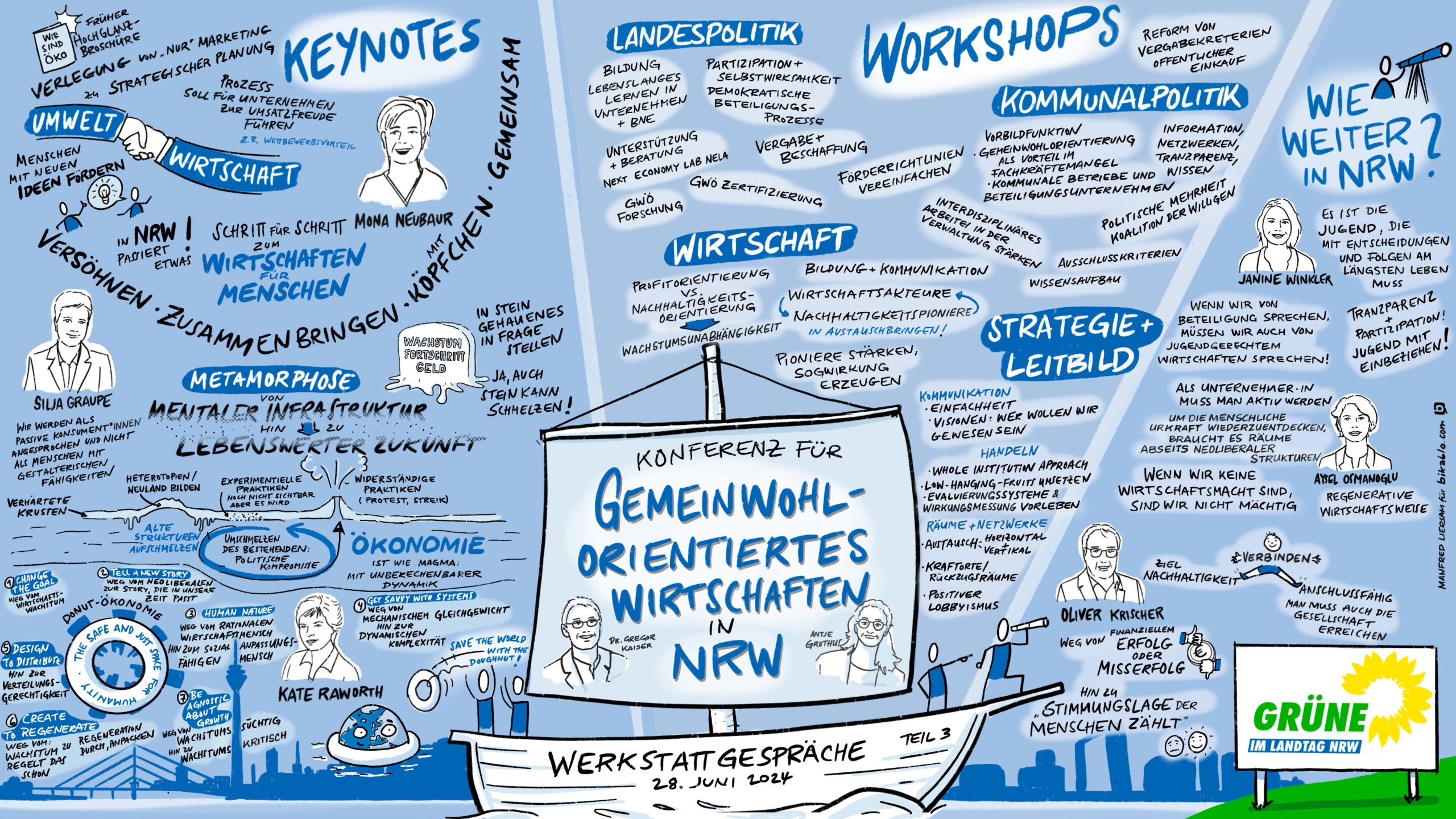 Am 28. Juni fand im Düsseldorfer Landtag das dritte Werkstattgespräch der Grünen-Fraktion NRW zur gemeinwohl-orientierten Wirtschaft statt, initiiert von Antje Grothus und Dr. Gregor Kaiser. Vertreter*innen der Gemeinwohl-Ökonomie diskutierten mit über 150 Gästen im Zentrum der parlamentarischen Macht, wie eine zukunftsfähige, resiliente Wirtschaft gelingen kann und wir die sozial-ökologische Transformation meistern können.